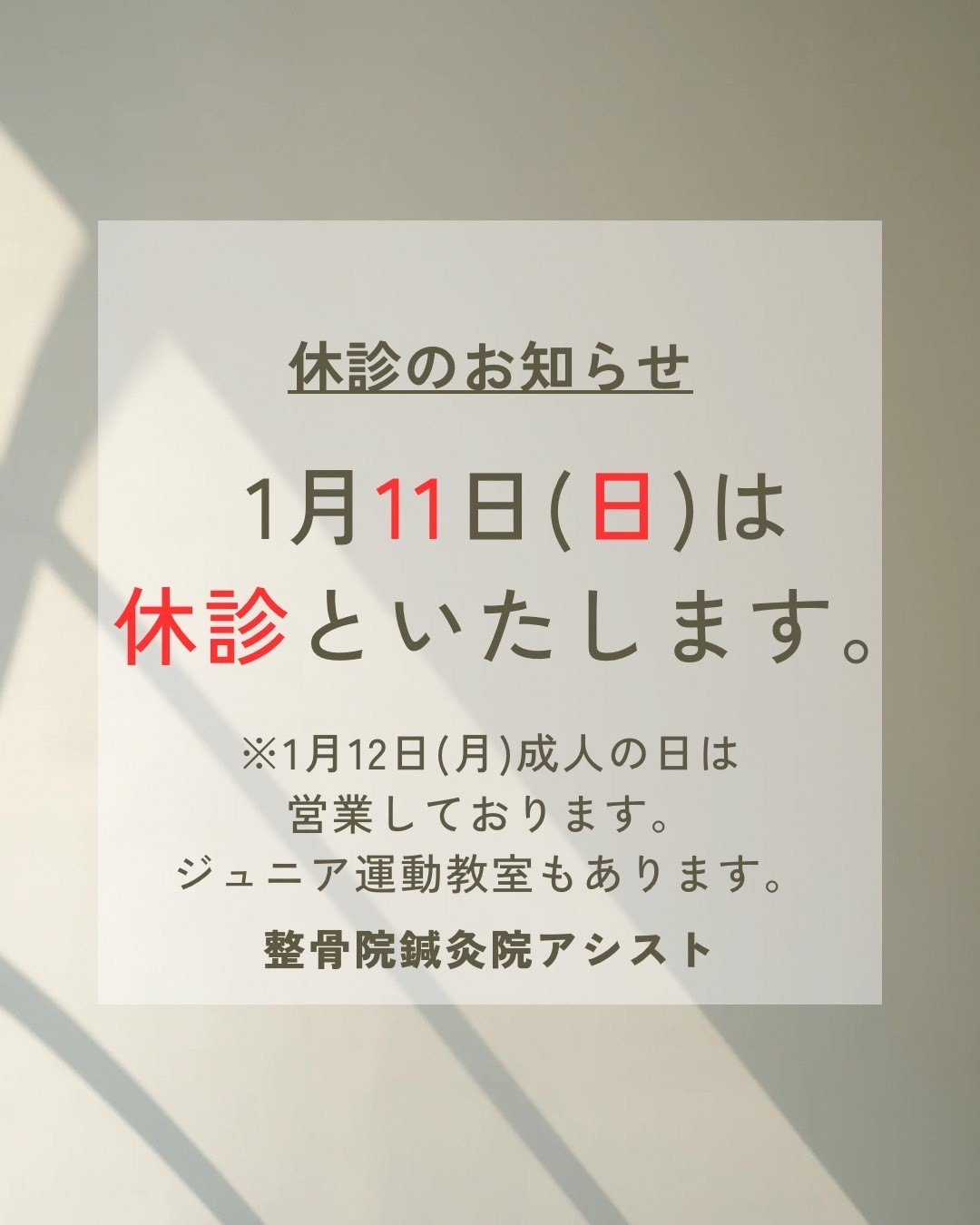 整骨院鍼灸院アシスト > ブログ > 未分類 > 1月11日【日】は休診日になります。 未分類 1月11日【日】は休診日になります。 2026.01.07 未分類 おはようございます! 整骨院鍼灸院アシストです。 今週1月11日【日】は休診日となります。 ご不便おかけしますが、よろしくお願いします。 << 前の記事へ 次の記事へ >> カテゴリー スタッフブログ (137) ジュニア運動教室 (89) 豆知識 (164) お知らせ (658) 未分類 (37) 最近の投稿 千葉中央駅から徒歩5分!【寝正月を過ごしてしまったあなたへ】 アシストのサポートチームが全国大会に出ております!! 1月11日【日】は休診日になります。 千葉中央駅から徒歩5分!【1月5日限定クーポン♪】 あけましておめでとうございます アーカイブ アーカイブ 月を選択 2026年1月 (6) 2025年12月 (22) 2025年11月 (14) 2025年10月 (12) 2025年9月 (13) 2025年8月 (16) 2025年7月 (23) 2025年6月 (23) 2025年5月 (9) 2025年4月 (9) 2025年3月 (3) 2025年2月 (3) 2025年1月 (5) 2024年12月 (8) 2024年11月 (4) 2024年10月 (1) 2024年9月 (2) 2024年8月 (3) 2024年7月 (4) 2024年6月 (6) 2024年5月 (2) 2024年4月 (6) 2024年3月 (4) 2024年2月 (7) 2024年1月 (5) 2023年12月 (3) 2023年11月 (8) 2023年10月 (11) 2023年9月 (11) 2023年8月 (11) 2023年7月 (11) 2023年6月 (6) 2023年5月 (10) 2023年4月 (7) 2023年3月 (2) 2023年2月 (3) 2023年1月 (1) 2022年12月 (9) 2022年11月 (10) 2022年10月 (7) 2022年9月 (9) 2022年8月 (6) 2022年7月 (7) 2022年6月 (10) 2022年5月 (7) 2022年4月 (5) 2022年3月 (8) 2022年2月 (10) 2022年1月 (3) 2021年12月 (10) 2021年11月 (8) 2021年10月 (9) 2021年9月 (7) 2021年8月 (9) 2021年7月 (8) 2021年6月 (11) 2021年5月 (8) 2021年4月 (12) 2021年3月 (4) 2021年2月 (4) 2021年1月 (8) 2020年12月 (10) 2020年11月 (7) 2020年10月 (11) 2020年9月 (6) 2020年8月 (2) 2020年7月 (5) 2020年6月 (3) 2020年5月 (12) 2020年4月 (10) 2020年3月 (7) 2020年2月 (3) 2020年1月 (7) 2019年12月 (10) 2019年11月 (6) 2019年10月 (9) 2019年9月 (6) 2019年8月 (4) 2019年7月 (7) 2019年6月 (3) 2019年5月 (6) 2019年4月 (5) 2019年3月 (11) 2019年2月 (7) 2019年1月 (7) 2018年12月 (5) 2018年11月 (3) 2018年10月 (9) 2018年9月 (6) 2018年8月 (8) 2018年7月 (7) 2018年6月 (6) 2018年5月 (6) 2018年4月 (5) 2018年3月 (7) 2018年2月 (3) 2018年1月 (5) 2017年12月 (7) 2017年11月 (7) 2017年10月 (5) 2017年9月 (5) 2017年8月 (2) 2017年7月 (7) 2017年6月 (7) 2017年5月 (4) 2017年4月 (4) 2017年3月 (2) 2017年2月 (2) 2017年1月 (7) 2016年12月 (4) 2016年11月 (6) 2016年10月 (4) 2016年9月 (3) 2016年8月 (7) 2016年7月 (5) 2016年6月 (4) 2016年5月 (4) 2016年4月 (5) 2016年2月 (6) 2016年1月 (4) 2015年12月 (4) 2015年11月 (6) 2015年10月 (4) 2015年9月 (3) 2015年8月 (4) 2015年7月 (1) 2015年6月 (1)